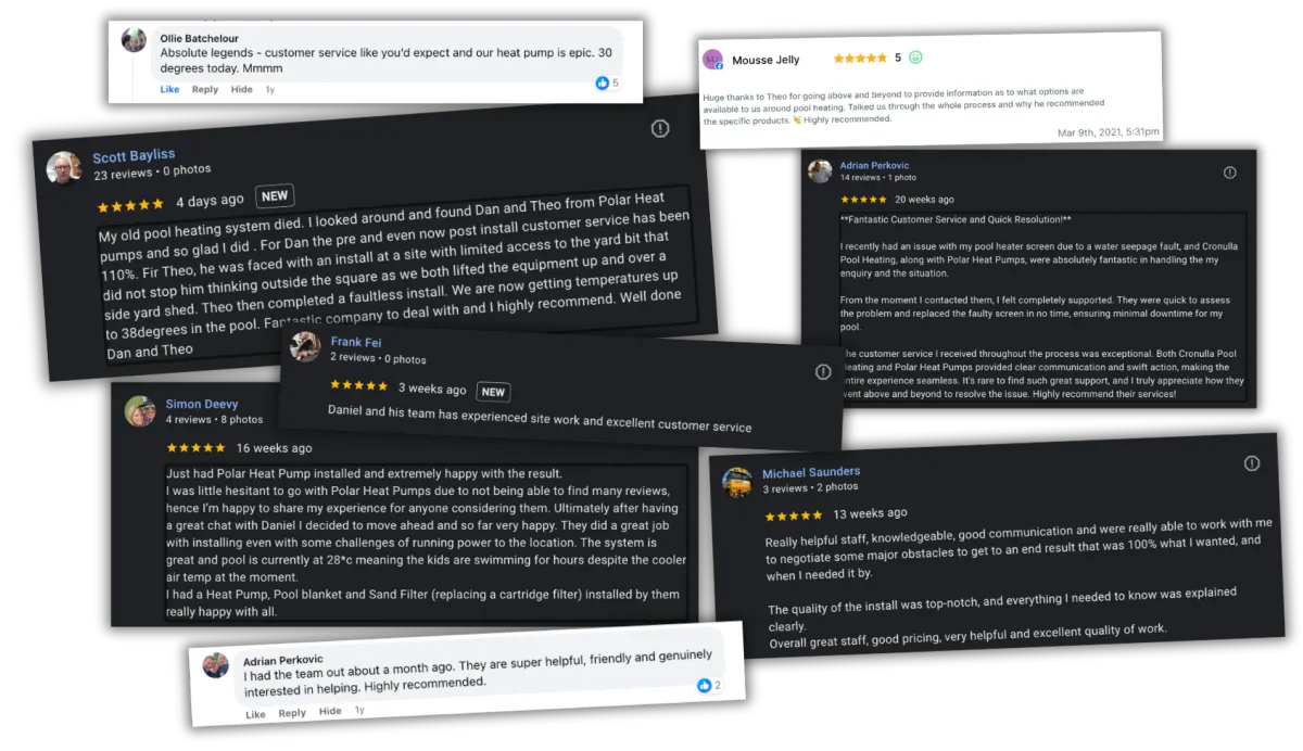 The customer service I received throughout the process was exceptional. Both Cronulla Pool Heating and Polar Heat Pumps provided clear communication and swift action, making the entire experience seamless. It's rare to find such great support, and I truly appreciate how they went above and beyond to resolve the issue. Highly recommend their services!